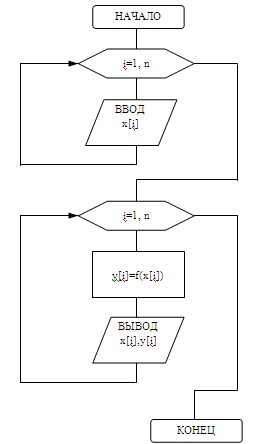 var x,y:array[0..3]of real; i:integer; z,j,d:real; begin randomize; for i:=0 to 3 do begin x[i]:=strtofloat(stringGrid1.cells[i,0]); j:=exp(x[i])-8.35*x[i]*x[i]; z:=exp(1/3*ln(abs(j)))*(abs(j)/j); d:=exp(x[i]*ln(37))+ln(abs(sin(2*x[i])))*(abs(2*x[i])/2*x[i]); y[i]:=z/d; stringgrid1.Cells[i,1]:=FormatFloat('0.000',y[i]); end; end; procedure TForm1.BitBtn2Click(Sender: TObject); begin form1.close; end; end. Вывод: т.к. ответы в Pascal,Excel,MathCAD и Delphi сошлись – решение верно. Блок-схема алгоритма решения задания №1.3 Нахождение функции заданном массиве: