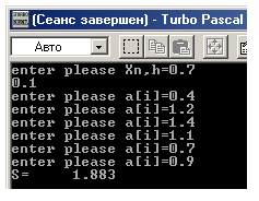 В Pascal: Program Summa; uses crt; const n=6; Var x,j,z,d,Xn,h,F,S:Real; i:Integer; a:array [1..n] of Real; BEGIN clrscr; randomize; Write('enter please Xn,h='); ReadLN(Xn,h); for i:=1 to n Do begin Write('enter please a[i]='); ReadLN(a[i]); end; x:=Xn; S:=0; for i:=1 to n Do begin j:=(ln(abs(3+x*x*x))*(abs(3+x*x*x)/(3+x*x*x)))-(exp((cos(x)*cos(x))*ln(2))); z:=exp(1/7*ln(abs(j)))*abs(j)/j; d:=sin(2*x)*cos(3*x)+sqrt(1+exp((x)*ln(2))); F:=z/d; S:=S+F*a[i]; x:=x+h; end; WriteLN('S=',S:10:3); END. Результаты вычислений: