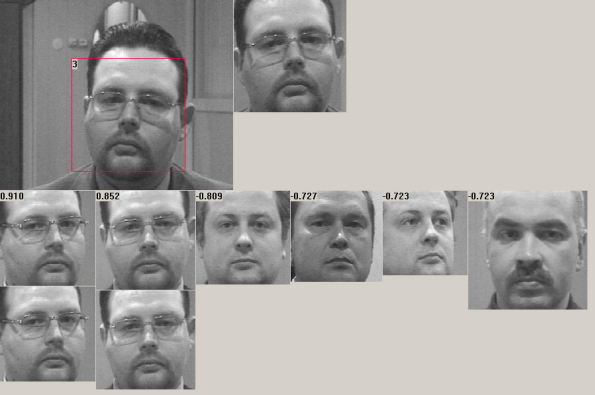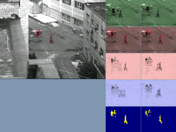 Рис.6. Выделение движущихся объектов сцены наблюдения У систем обнаружения и сопровождения движущихся объектов могут быть различные функции, такие как: • обнаружение новых объектов сцены наблюдения; • обнаружение пропавших объектов сцены наблюдения; • регистрация новой сцены наблюдения; • контроль отсутствия сдвигов камеры относительно сцены наблюдения. 5.1.2. Система считывания регистрационных номеров автомобилей Как уже говорилось, одной из функций систем видеонаблюдения является считывание идентификационных меток объектов, прежде всего – номеров транспортных средств, пересекающих зону наблюдения. Одним из типовых приложений такого рода является разработанная в ИИТ система выделения и распознавания номерных знаков автомашин в потоке на автомагистрали. Система считывания автомобильных номеров реализована на базе системы видеонаблюдения «Интеллект» фирмы ITV и внедрена на ряде зарубежных автомобильных трасс [Визильтер и др., 2007] . Функции системы: • регистрация появления автомобиля (подсчет автомобилей); • выделение номерного знака; • распознавание символов номерного знака; • сохранение распознанного номера в базе данных. 5.2 Биометрия В последние годы во всем мире наблюдается все возрастающий интерес к методам распознавания и идентификации личности. Основные пути и способы решения этих задач лежат в области разработки биометрических систем. В биометрических системах для распознавания человека используется совокупность биометрических характеристик, основанных на биологических особенностях человеческого тела. В качестве таких биометрических характеристик могут выступать голос, почерк, отпечатки пальцев, геометрия кисти руки, рисунок сетчатки или радужной оболочки глаза, лицо и ДНК. Биометрическая защита более эффективна в сравнении с такими методами, как использование паролей, PIN-кодов, смарт-карт поскольку биометрия позволяет идентифицировать именно конкретного человека, а не устройство. Традиционные методы защиты не исключают возможности потери или кражи информации, вследствие чего она становится доступной незаконным пользователям. Уникальный биометрический идентификатор, каковым является, например, отпечаток пальца или изображение лица, служит ключом, который невозможно потерять. Биометрическая система безопасности позволяет отказаться от парольной защиты либо служит для ее усиления. Одной из основных причин, которые существенно повысили значимость автоматической обработки и анализа биометрической информации, явилось повышение требований к функциональным возможностям автоматических систем безопасности, расположенных в общественных местах (вокзалы, супермаркеты и т. п.) Рассмотрим несколько примеров биометрических приложений, встречающихся на практике. 5.2.1. Система обнаружения и распознавания лиц В ИИТ разработана технология обнаружения и распознавания лиц по двумерным изображениям, включающая три основных модуля: • детектирование (обнаружение) лиц; • индексация (кодирование и последующий быстрый поиск лиц в базе); • идентификация лиц. Модули применяются последовательно. Выделенные на текущем кадре изображения лиц поступают в систему индексации, которая в ответ указывает заданное количество «кандидатов» из хранящейся базы изображений лиц, наиболее похожих на текущее изобра
