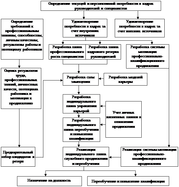 Содержание Введение 1. Сущность и виды профессионально-квалификационного продвижения 2. Система управления карьерой 3. Формирование резерва на выдвижение Заключение Список используемой литературы Введение Карьера – это уникальное понятие. Оно одновременно обозначает процесс и состояние. Мы говорим «он сделал карьеру», подразумевая высокую должность или статус, достигнутый человеком. Вместе с тем, «карьерист» - это человек, который «делает карьеру», т.е. находится в процессе достижения желаемого статуса или позиции в организации. С уходом советских стереотипов меняется и оценка понятия «карьера» в коллективном сознании. Карьерная ориентация в настоящее время – это социально одобряемый признак личности. Карьерная ориентация, или ориентация на профессиональные достижения, является одним из факторов успешности личности в организации. Более того, она признается в качестве источника успешности организации в целом. То есть ориентированные на карьеру работники, при грамотной политике управления человеческими ресурсами, конечно, в состоянии создать более успешную компанию. Каждый работодатель заинтересован, чтобы в компании трудились высокопрофессиональные, лояльные и мотивированные на результат сотрудники. Профессиональное развитие является одним из важнейших мотивирующих факторов работников. 1. Сущность и виды профессионально-квалификационного продвижения Профессионально-квалификационное продвижение – это процесс изменения положения работника в должностной структуре, связанный с ростом квалификации и необходимостью предоставления ему работы соответствующей сложности[1] . Система профессионально-квалификационного продвижения рабочих призвана решать такие задачи, как: - закрепление на предприятиях стабильного контингента рабочих; - повышение эффективности использования кадров; - создание возможности для получения рабочим в перспективе соответствующей его интересам и запросам работы; - своевременное обеспечение производства высококвалифицированными кадрами; - обеспечение кадрами рабочих мест малопривлекательного и неквалифицированного труда, с неблагоприятными условиями труда. Правильно организованной системе профессионально-квалификационного продвижения рабочих отводится роль внутреннего регулятора согласования интересов производства и каждого конкретного рабочего. Отметим основные принципы, на которых должно строиться продвижение рабочих: - последовательное, планомерное, непрерывное движение рабочих от низших к высшим ступеням профессиональной квалификации; - построение трудовой карьеры таким образом, чтобы на каждой последующей работе в наибольшей степени использовались знания и опыт, полученные на предыдущей; - непрерывное развитие и обогащение образовательного, культурного уровня и профессионального опыта рабочих, сохранение их здоровья; - первоочередное продвижение рабочих, занятых на непривлекательных и с неблагоприятными условиями труда рабочих местах; - преимущественное предоставление работы на местах с благоприятными условиями труда и по профессиям сложного труда работникам данного предприятия; - информированность рабочих предприятия о перспективах продвижения и о реальном продвижении; - моральная и материальная заинтересованность рабочих в профессионально-квалифи