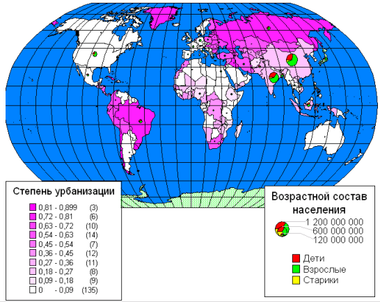 Рис. 1. Демографическая ситуация в мире Этот пример был создан на основе файла Mapstats.xls, включённого в стандартный набор примеров по картографии для MS Excel. В него включены демографические данные по России, по странам мира и Европы – половозрастная структура, количество рабочих и т.п. К сожалению, из-за неполноты сведений в файле Mapstats.xls многие страны выглядят на карте белыми пятнами. Шаги выполнения: 1 Выбраем диапазон. При этом один из столбцов диапазона должен содержать имеющиеся в базе данных названия географических объектов (например, названия стран). 2 В меню Вставка выбираем команду Карта или нажимаем кнопку 3 С помощью мыши указываем область, в которую следует поместить карту на листе Excel. Нажав кнопку