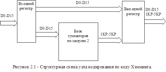 Вхідний регістр представляє з себе буфер і призначений в основному для підтримки логічних рівнів напруги в заданих межах. Блок суматорів по модулю 2 є кодуючим пристроєм, перетворююче інформаційне слово в корегуюче по алгоритмах описаних вище. Містить п'ять суматорів по модулю 2 здійснюючої функції описані в таблиці 2. Вихідний регістр окрім буферних функцій також виконує об'єднання контрольних розрядів і інформаційних розрядів відповідно до розрядної сітки . 2.2.3Разработка функціональної схеми вузла контролю. Проектований пристрій призначається для передачі шістнадцяти бітової інформації шини даних накопичувача на жорстких магнітних дисках. Виходячи з цього вхідний регістр також повинен мати розрядність 16 біт. З виходів вхідного регістра інформація повинна поступати на кодуюче пристрій з метою отримання корегуючого слова і на вихідний регістр без зміни відповідно до розрядної сітки. Кодуючий пристрій є набором з 5 суматорів по модулю 2, кожний з яких здійснює функцію отримання свого контрольного розряду. Перший суматор по модулю 2 виконує функцію отримання першого контрольного розряду по формулі з таблиці 3: 1кр=3рÅ5рÅ7рÅ9рÅ11рÅ13рÅ15рÅ17рÅ19рÅ21р (2.1.) для цього на його входи подаються відповідні розряди. Вихідний контрольний розряд поступає на перший розряд вихідного регістра відповідно до розрядної сітки. Другий суматор по модулю 2 виконує функцію отримання другого контрольного розряду по формулі з таблиці 3: 2кр=3рÅ6рÅ7рÅ10рÅ11рÅ14рÅ15рÅ18рÅ19р (2.2.) для цього на його входи подаються відповідні розряди. Вихідний контрольний розряд поступає на другий розряд вихідного регістра відповідно до розрядної сітки. Третій суматор по модулю 2 виконує функцію отримання третього контрольного розряду по формулі з таблиці 3: 3кр=5рÅ6рÅ7рÅ12рÅ13рÅ14рÅ15рÅ20рÅ21р (2.3.) для цього на його входи подаються відповідні розряди. Вихідний контрольний розряд поступає на четвертий розряд вихідного регістра відповідно до розрядної сітки. Четвертий суматор по модулю 2 виконує функцію отримання четвертого контрольного розряду по формулі з таблиці 3: 4кр=9рÅ10рÅ11рÅ12рÅ13рÅ14рÅ15р (2.4.) для цього на його входи подаються відповідні розряди. Вихідний контрольний розряд поступає на восьмий розряд вихідного регістра відповідно до розрядної сітки. П'ятий суматор по модулю 2 виконує функцію отримання п'ятого контрольного розряду по формулі з таблиці 3: 5кр=17рÅ18рÅ19рÅ20рÅ21р (2.5.) для цього на його входи подаються відповідні розряди. Вихідний контрольний розряд поступає на шістнадцятий розряд вихідного регістра відповідно до розрядної сітки. Розрядність вихідного регістра відповідно до таблиці 1 буде 21 біт: 16 інформаційних розрядів + 5 контрольних. Після вихідного регістра інформація через зону перешкод поступає на декодуюче пристрій. Представлена на рисунку 2.2 функціональна схема вузла кодування повністю відповідає вище розглянутому опису принципу роботи.