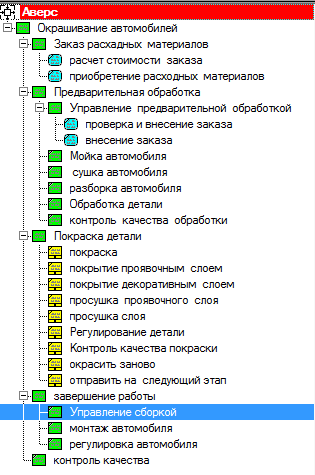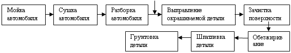 Технологический процесс предприятия заключается в последовательном выполнении шагов на различных стадиях выполнения заказа. Выполнение заказа начинается с правильной подготовки автомобиля или детали к окраске. Сначала автомобиль тщательно и неоднократно моется водой, а после сушиться в специальной камере при температуре 90 0С. Затем с автомобиля снимают все декоративные детали с гальваническим покрытием, резиновые прокладки. Затем кузов разбирается на части для чего снимается капот, крышка багажника, двери и в некоторых случаях крылья. Если деталь деформирована, то ее выправляют и придают ей нужную форму. Затем производится зачистка поверхности от старой краски и ржавчинами путем обработки ее наждачной бумагой и стальными щетками с различного рода растворами. Затем поверхность кузова обезжиривается уайт-спиртом. Проверка качества обезжиривания проводится с помощью фильтровальной бумаги: если на бумаге остаются следы жира или грязи, то поверхность необходимо промыть растворителем еще раз (а возможно, и не раз — пока она не будет полностью обезжирена). Затем поверхность выравнивается с помощью шпатлевки. Толщина слоя шпатлевки не должна превышать 0,3 мм. Время сушки зашпатлеванной поверхности должно выдерживаться в соответствии с техническими условиями на используемую шпатлевку. После высыхания шпатлевки следует загрунтовать зашпатлеванные места. После проведения подготовительных работ приступают к следующему этапу. Этот этап включает в себя замывку детали, то есть обработку ее крупной шкуркой с водой для удаления неровностей, после чего деталь последний раз грунтуют для лучшего наложения краски и ее фиксации. Затем производят еще одну замывку детали мелкой шкуркой с водой для выравнивания окрашиваемой поверхности и убирания лишних слоев грунтовки, после чего приступают к окрашиванию детали. Окрашивание происходит в два этапа через пульверизатор: первый- нанесение проявочного слоя краски отчетливо проявляющий все дефекты подготовленной поверхности (краска разводится 1 к 4 с растворителем); второй - через 20 минут после нанесения проявочного слоя краски, можно наносить основной, декоративный слой(краска разводится 1 к 3 с растворителем). Оба слоя наносятся быстрыми горизонтальными движениями сверху вниз. В зависимости от пожеланий клиента выполняется аэрография. После нанесения краски автомобиль сушится в сушильной камере при температуре 90 0С 2-3 дня. Затем производиться сборка кузова и крепятся обратно декоративные детали с гальваническим покрытием, резиновые прокладки. Затем производится контроль качества выполненной работы. На этом этапе производится осмотр внешнего вида автомобиля, качество и полнота его сборки после завершения окраски, и качество окраски автомобиля. В завершении вырабатываются рекомендации по выполнению следующих заказов. Разрабатываемая ИС должна позволять вести обработку, учет и контроль информации по работе предприятия. Обработка – добавление, удаление и изменение данных о работающих сотрудниках, расходных материалах. Учетом является быстрый поиск информации по базе данных. Контроль осуществляется над остатками расходных материалов, при их поставке учитывается их количество, дата прихода и их стоимость, а также качеством выполняемой сотрудниками работы. Система создае