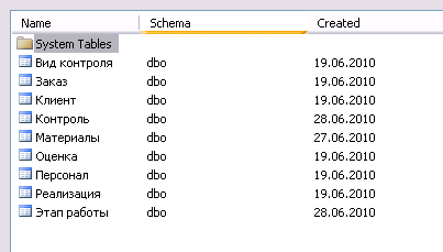 Рис 2.2. Физическая модель данных 3. РЕАЛИЗАЦИЯ ПРОЕКТА 3.1 Серверная часть Серверная часть проекта базируется на СУБД SQL Server 2005. SQL Server - система управления реляционными базами данных, разработанная корпорацией Microsoft. Основной используемый язык запросов — Transact-SQL, создан совместно Microsoft и Sybase. Transact-SQL является реализацией стандарта ANSI/ISO по структурированному языку запросов (SQL) с расширениями. Используется для работы с базами данных размером от персональных до крупных баз данных масштаба предприятия. Для обеспечения доступа к данным Microsoft SQL Server поддерживает Open Database Connectivity (ODBC) — интерфейс взаимодействия приложений с СУБД. Версия SQL Server 2005 обеспечивает возможность подключения пользователей через веб-сервисы, использующие протокол SOAP. Это позволяет клиентским программам, не предназначенным для Windows, кроссплатформенно соединяться с SQL Server. Компания Microsoft также выпустила сертифицированный драйвер JDBC, позволяющий приложениям под управлением Java (таким как BEA и IBM WebSphere) соединяться с Microsoft SQL Server 2000 и 2005. Для создания серверной части была создана новая база данных Avers. Размер файла данных обозначен в 20 мб, файл лога в 3 мб. Имеется возможность работать сразу нескольким пользователям с таблицами БД. Данная БД совместима только с SQL Server 2005. Все остальные параметры были оставлены по умолчанию. В следствии использования для клиентской части MS Access 2007, AllFusion ERwin Data Modeler не имел возможности перенести данные в данную версию (ERwin интегрирует данные в MS Access 2000/2002/2003). В результате не было возможности использовать AllFusion ERwin Data Modeler для переноса данных и таблицы. В результате в БД были созданы новые таблицы, идентичные таблицам в AllFusion ERwin Data Modeler. Для создания таблицы, необходимо открыть раздел "Tables" и вызвать меню "New Table...". В Microsoft SQL Server получили необходимые таблицы(рис.3.1.1). Ключевые поля полностью соответствуют аналогичным полям в ERwin. Все поля, кроме ключевых, не должны иметь пустых значений.