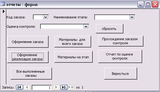Рис.3.21.Отчет о реализации заказа. Так же реализован запрос о прохождении стадий контроля определенным заказом (рис.3.22). Интересующий заказ выбирается на форме «Отчеты» и после нажатия на кнопку «Прохождение заказом контроля» будет предоставлен отчет в виде формы (рис.3.23.).