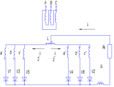 Рисунок 1. «Схема выпрямления с уравнительным реактором» В этой схеме трансформатор имеет одну первичную обмотку, соединённую в треугольник, и две группы вторичных обмоток, каждая из которых соединена в звезду, причём в первой группе нулевая точка образована концами обмоток, а во второй группе - началами обмоток. Таким образом, фазные напряжения смещены дуг относительно друга на 180 ̊. В результате имеем два трёхфазных выпрямителя, работающих параллельно через уравнительный реактор на общую нагрузку. Основные параметры выпрямителя 1) Ориентировочное значение напряжения холостого хода выпрямителя: Udxx =(1,4÷1,8)∙Ud н =(1,4÷1,8)∙50=70÷90(В) Ud н – номинальное выпрямленное напряжение Принимаем Udxx =80(В) 2) Длительно допустимый по нагреву ток выпрямителя: Id