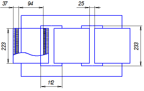 Рисунок 2. « Катушка трансформатора с первичной и вторичной обмотками из изолированного провода» 4.10. Расстояние между катушками соседних стержней: ∆кат =bо -∆ш -2δ ∆кат =112-12-2∙37=25 (мм) После уточнения всех размеров выполним эскиз трансформатора: