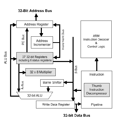 Рис. 1. Блок-схема процессора ядра ARM7TDMI Этот набор сигналов позволяет ARM7TDMI достаточно просто организовывать интерфейс с DRAM, SRAM и ROM. Для полного использования страничного режима доступа к DRAM, обеспечивается информация о том, является доступ к памяти последовательным или нет. Вообще говоря, интерфейс со статической памятью намного проще чем интерфейс с динамической памятью. Поскольку ядро ARM7TDMI в основе своей имеет ядро ARM7, то ограничимся кратким напоминанием о его архитектуре и больше внимания уделим особенностям, внесенным технологией Thumb. Процессор ARM7TDMI - 32-разрядный RISC процессор с 3-уровневым конвейером, сформированный вокруг банка из 37 32-разрядных регистров, в который входят 6 регистров состояния. Процессор оснащен встроенным умножителем 32x8 и 32-разрядным многорегистровым циклическим устройством сдвига. Пять независимых встроенных шин (PC шина, шина инкремента, шина ALU и A- и B-шины) обеспечивают, при выполнении команд высокую степень параллелизма. Как видно из сравнения блок-схем процессоров ARM7 и ARM7TDMI (См. Рис. 1) в блоке конвейера процессора добавился декомпрессор команд Thumb. Однако разработчики фирмы ARM этим не ограничились и, имея в виду встраивание ядра в приборы с большим уровнем интеграции, расширили ядро ARM7TDMI (см. Рис. 2) дополнительными аппаратными блоками, обеспечивающими возможность отладки глубоко встроенного ядра.