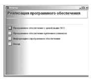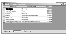 Рисунок 7 – Результаты запроса по формированию списка располагаемого фирмой программного обеспечения Программа позволяет формировать отчеты, такие как «Программное обеспечение купленное клиентом» (открывается форма для ввода параметров поиска), «Программное обеспечение с ценой выше 50 $», «Информация о программном обеспечении». Вид формы «Отчеты» представлен на рисунке 8.