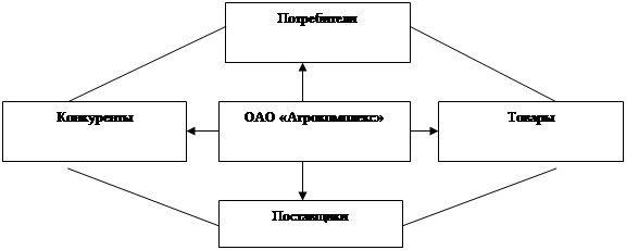 Таблица 1 свидетельствует о том, что стоимость одного литра молока не менялась в течении 2008 года, уровень цены зависел от возможного масштаба производства и от объема продаж. Объем продаж молока в Iквартале составил 7000 литров, во IIквартале 6000 литров, в IIIквартале 10000 литров, а IYквартале 8000 литров, в целом за 2008 год было реализовано продано 31000 литров молока. Общая выручка составила за 2007 год 403 000 рублей. Продуктовая политика должна быть направлена в будущее и учитывать, что все товары вне зависимости от своего успеха - смертны, т.е. рано или поздно придется эффективнее использовать существующую систему товародвижения. Для этого необходимо вести наблюдения по товару, лист наблюдения представлен в таблице 2. И так, из наблюдений видно, что предприятие ОАО "Агрокомплекс" пытается максимизировать эффективность созданной им системы реализации, но покупатели дают фирме понять, что данный продукт не обладает достаточно существенными отличительными преимуществами своей продукции по качеству других производителей молока, оно не обогащено йодом, фруктами, высокой жирностью и т.д. Канал товародвижения предприятия ОАО "Агрокомплекс" носит традиционный характер, и реализует товар через оптовиков, которые имеют дело с розничными магазинами. Предприятие ОАО "Агрокомплекс" использует скидки, рекламу. В результате условий жесткой конкуренции предприятию ОАО "Агрокомплекс" необходимо стремится к технологическим прорывам для реагирования на меняющиеся характеристики потребителей и изменения стиля жизни. Хорошее долгосрочное планирование новой продукции требует: систематических исследований и разработок, увязки требований предъявляемых к новым товарам, с возможностями предприятия ОАО "Агрокомплекс". Графическое изображение деятельности предприятия ОАО "Агрокомплекс" на рынке представлено на рис.1 рынок потребитель канал товародвижение Рис.1. Деятельность предприятия ОАО "Агрокомплекс" на рынке