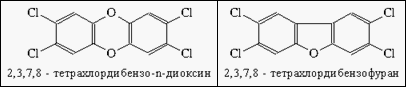 Рис. 1. Структурні формули найбільш токсичних діоксиноподібних речовин. Дибензо-n-діоксини відносяться до гетероциклічних полі хлорованих сполук, в структурі яких присутні два ароматичних кільця, зв’язаних між собою двома кисневими містками