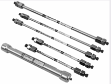 Рис. 1 Блок-схема жидкостного хроматографа: 2 – насос предназначен для создания постоянного потока растворителя. Его конструкция определяется, прежде всего, рабочим давлением в системе. Для работы в диапазоне 10-500 МПа используются насосы плунжерного (шприцевого), либо пистонного типов. Недостатком первых является необходимость периодических остановок для заполнения элюентом, а вторых - большая сложность конструкции и, как следствие, высокая цена. Для простых систем с невысокими рабочими давлениями 1-5 МПа с успехом применяют недорогие перистальтические насосы, но так как при этом трудно добиться постоянства давления и скорости потока, их использование ограничено препаративными задачами. 3 - инжектор обеспечивает ввод пробы смеси разделяемых компонентов в колонку с достаточно высокой воспроизводимостью. Простые системы ввода пробы - "stop-flow" требуют остановки насоса и, поэтому, менее удобны, чем петлевые дозаторы, разработанные фирмой Reodyne. 4 - колонки для ВЭЖХ представляют собой толстостенные трубки из нержавеющей стали, способные выдержать высокое давление. Большую роль играет плотность и равномерность набивки колонки сорбентом. Для жидкостной хроматографии низкого давления с успехом используют толстостенные стеклянные колонки. 5 – термостат обеспечивает постоянноство температуры. 6 – детекторы для жидкостной хроматографии имеют проточную кювету, в которой происходит непрерывное измерение какого-либо свойства протекающего элюента 7 - регистрирующая система в простейшем случае состоит из дифференциального усилителя и самописца. Желательно также наличие интегратора, позволяющего рассчитывать относительные площади получаемых пиков. В сложных хроматографических системах используется блок интерфейса, соединяющий хроматограф с персональным компьютером (8), который осуществляет не только сбор и обработку информации, но и управляет прибором. [11] 3. Колоночный вариант Разделение смеси веществ в жидкостно-жидкостной хроматографии основываются на различии коэффициентов распределения вещества между несмешивающимися растворителями. Коэффициент распределения вещества равен: Кп,н =сп /сн где сп и сн — концентрация вещества в подвижной и неподвижной фазах. Для членов одного гомологического ряда установлены некоторые закономерности в величинах Кп.н . Известна, например, зависимость Кп.н в данном гомологическом ряду от числа атомов углерода. Поиск несмешивающихся фаз, обеспечивающих разделение, обычно производится эмпирически на основе экспериментальных данных. Широкое применение в жидкостно-жидкостной хроматографии получили тройные системы, состоящие из двух несмешивающихся растворителей и третьего, растворимого в обеих фазах. Такие системы позволяют получать набор несмешивающихся фаз различной селективности. В качестве примера можно привести систему из несмешивающихся между собой гептана и воды, в которую введен этанол, растворяющийся в обоих растворителях. Хотя в качестве подвижной и неподвижной фаз выбираются растворители, не смешивающиеся между собой, все же во многих системах наблюдается некоторая взаимная растворимость. Чтобы предотвратить процессы взаимного растворения жидкостей в ходе хроматографирования, подвижную жидкую фазу предварительно насыщают неподвижной. Для сохранения неизменного со