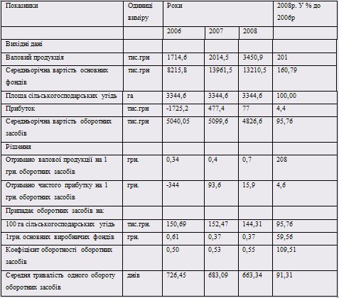 Аналізуючи дані таблиці, ми бачимо, що такі показники, як фондовіддача основних виробничих фондів і загальний коефіцієнт фондовіддачі істотно зменшилися на 34,78%%. Тенденція до спаду показника фондовіддачі свідчить про негативи у використанні цього ресурсу. Із ростом фондоємності виробництва, а саме в 2006 році 3,24 грн., до 4,97 грн. в 2008 році, створилися об’єктивні передумови до зниження фондовіддачі. Із збільшенням основних виробничих фондів в 2008 році на 60,79% зменшилася кількість валового доходу і збитку на 100грн. основних виробничих фондів, відповідно на 91,26% і 61,43%. Важливим напрямком поліпшення використання виробничих ресурсів є встановлення оптимального співвідношення між основними і оборотними фондами. На 1грн. основних виробничих фондів с/г призначення припадає оборотних засобів в 2006році – 0,61грн., в 2008році – 0,37грн. Нестача оборотних фондів знижує ефективність використання основних фондів, негативно відбивається на кінцевих результатах господарювання. Із зменшенням коефіцієнта оборотності на 3,1%, спостерігається зменшення процесу вивільнення ресурсів, а тим самим знижується ефективность виробництва. Оборотні фонди з економічного погляду є авансованою вартістю на стадії виробництва, але водночас частина авансованої вартості перебуває і на товарній, і на грошовій стадіях. Ці кошти називають фондами обігу. Сукупність оборотних фондів і фондів обігу утворюють категорію оборотних засобів. Розглянемо показники економічної ефективності використання оборотних засобів в таблиці 2.2.5.(див.нижче) Таблиця 2.2.5. Показники економічної ефективності використання оборотних засобів