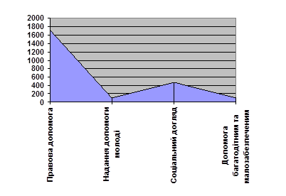Рисунок 3.12. Динаміка створення організацій Діяльність вище зазначених організацій здійснюється у таких основних напрямах: сприяння практичному здійсненню загальнодержавних, регіональних, місцевих та міжнародних програм, що спрямовані на поліпшення соціально-економічного становища; поліпшення матеріального становища набувачів благодійної допомоги, сприяння соціальній реабілітації малозабезпечених, безробітних, інвалідів, інших осіб, які потребують піклування, а також подання допомоги особам, які через свої фізичні або інші вади обмежені в реалізації своїх прав і законних інтересів; подання допомоги громадянам, які постраждали внаслідок стихійного лиха, екологічних, техногенних та інших катастроф, у результаті соціальних конфліктів, нещасних випадків, а також жертвам репресій, біженцям; сприяння розвитку культури, в тому числі реалізації програм національно-культурного розвитку, доступові всіх верств населення, особливо малозабезпечених, до культурних цінностей та художньої творчості; подання допомоги талановитій творчій молоді; сприяння охороні і збереженню культурної спадщини, історико-культурного середовища, пам'яток історії та культури, місць поховання; сприяння розвитку охорони здоров'я, масової фізичної культури, спорту і туризму, пропагування здорового способу життя, участь у поданні медичної допомоги населенню та здійснення соціального догляду за хворими, інвалідами, одинокими, людьми похилого віку та іншими особами, які через свої фізичні, матеріальні чи інші особливості потребують соціальної підтримки та піклування; сприяння захисту материнства та дитинства, подання допомоги багатодітним та малозабезпеченим сім'ям. Аналіз затребуваності громадськістю вище зазначених послуг недержавних організацій постійно зростає, у зв’язку із доступністю та ефективним досягненням цілей (Табл.3.3, Рис.3.14). Таблиця 3.3 Кількість послуг наданих недержавними організаціями Деражнянського регіону за 2008 - 2010 рр.