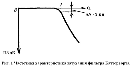 1) Тип фильтра – НЧ (низкочастотный) 2) Минимально-допустимое значение рабочего ослабления в ПЗ Amin - 55 дБ 3) Неравномерность затухания в полосе пропускания ∆A - 1,5 дБ 4) Сопротивление генератора и нагрузки Rг , Rн - 3,0 Ом 5) Частота полосы пропускания f0 – 180 кГц 6) Коэффициент пропускания (Кпр = ПЗ / ПП) Кпр – 2,5 Для создания электрического фильтра надо выбрать Аппроксимирующий полином: Я для работы выбрал Аппроксимирующий полином — Баттерворта. Расчёты для фильтра 5-го порядка. Фильтрами НЧ (ФНЧ) называют фильтры, пропускающие в нагрузку лишь низкие частоты: с ω1 = 0 до ω2 . Полоса их затухания находится в интервале от ω2 до ∞. Фильтры НЧ можно классифицировать в зависимости от их характеристик. Характеристика затухания фильтра Баттерворта приведена на рис.1. Фильтр Баттерворта характеризуется монотонным изменением затухания в полосе пропускания и задерживания. Затухание в полосе задерживания (ПЗ) изменяется приблизительно на 6 дБ за октаву для каждого элемента схемы. Например, пятиэлементный фильтр будет иметь затухание 30 дБ при двойной частоте среза и 60 дБ при учетверенной частоте среза. За нормированную частоту Ω = l для фильтра Баттеворта принимается частота, на которой затухание составляет 3 дБ.