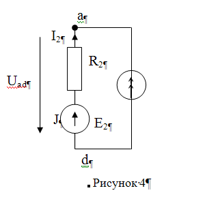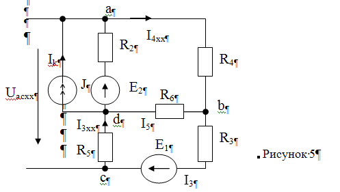 åРист =åРпр åРист =åEI-Uа d Ik Находим напряжение Uа d по второму закону Кирхгофа: Uа d +I2 R2 =E2 Uа d =E2 -I2 R2 Uа d =34-0.202*40=25,92B Pист =E2 I2 +E1 I3 +Uа d Ik Pист =34*0.202+125*1.701+25.92*0.2=224.6 Вт Pпр =I1 2 R1 + I2 2 R6 + I3 2 R3 + I4 2 R4 + I5 2 R5 + I6 2 R2 Pпр =(1.196)2 *10+(0.202)2 *40+(1.701)2 *50+(1.598)2 *17.5+(0.505)2 *75+(0.103)2 *20 Pпр =224.6Вт Рист =Рпри 5. Определим ток методом эквивалентного генератора Из первоначальной схемы (рисунок 1) определим активный двухполосник (рисунок 5).