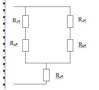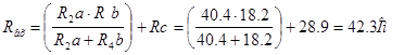 Резисторы R2 и Rа соединены также как и резисторы R4 иRb - последовательно. Найдем их сопротивление и преобразуем схему. R2 a= R2 +Ra =40+10.4=40.4 Ом R4 b= R4 +Rb =17.5+0.7=18.2 Ом
