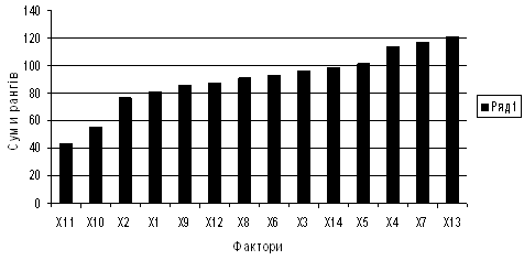 Фактор, який з точки зору опитуваних респондентів найбільше впливає на досліджуваний показник, має найменшу суму рангів, а фактор, що найменше впливає – найбільшу суму рангів. Побудуємо гістограму розподілу сум рангів впливу відібраних факторів на розвиток оподаткування в Україні., основуючись на отриманих сумах рангів по строках. При цьому на осі абсцис відкладаються відповідні фактори, а на осі ординат – їх відповідні суми.