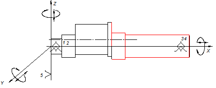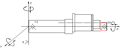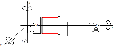 Рисунок 5 - Схема базирования заготовки 015 операции На 020 токарной с ЧПУ операции базируемся по центровым отверстиям, выбрав ее в качестве чистовой базы и торцу для обработки базовой поверхности для черновой и чистовой обработки поверхностей диаметром 30,233 и 35 и подрезки торцов в размер 102 и 84 мм Данная схема базирования лишает заготовку 5 степеней свободы -перемещения вдоль осей XYZ и поворота вокруг осей YZ. Торец является опорной базой и лишает заготовку 1-х степеней свободы, а наружная цилиндрическая поверхность – двойной направляющей базой, лишающей заготовку 4-х степеней свободы. Торец и центровые отверстия являются чистовыми базами и используются неоднократно. Такая схема реализуется при установке заготовки в комбинированном патроне и заднем центре.