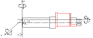 Рисунок 10 - Схема базирования заготовки 040 операции На шлифовальных 055,065 операции применяется базирование в поводковом патроне и заднем центре. Данная схема базирования применяется для шлифования поверхностей диаметром 20 k6, 30 k6 шероховатостью Ra=1,25 мкм. Данная схеме базирования лишает заготовку 5-ти степеней свободы - перемещения вдоль осей XYZ и поворота вокруг осей YZ. Ось является двойной направляющей базой и лишает деталь 4 степеней свободы; торец являются опорной базой и лишает 1 степени свободы.