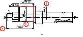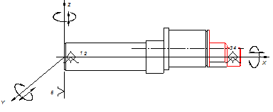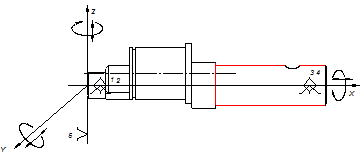 Рисунок 7 - Схема базирования заготовки 025 операции На 030 токарной с ЧПУ операции базируемся по центровым отверстиям, выбрав ее в качестве чистовой базы и торцу для обработки базовой поверхности для черновой и чистовой обработки поверхностей диаметром 30 и 20,233 и подрезки торцов в размер 32 и 14 мм Данная схема базирования лишает заготовку 5 степеней свободы -перемещения вдоль осей XYZ и поворота вокруг осей YZ. Торец является опорной базой и лишает заготовку 1-х степеней свободы, а наружная цилиндрическая поверхность – двойной направляющей базой, лишающей заготовку 4-х степеней свободы. Торец и центровые отверстия являются чистовыми базами и используются неоднократно. Такая схема реализуется при установке заготовки в комбинированном патроне и заднем центре.
