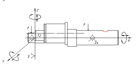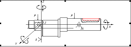 Рисунок 8 - Схема базирования заготовки 020 операции На фрезерных 035,040 операциях базируемся по цилиндрической поверхности и торцу для обработки, шпоночного паза 8 и лыски радиусом 7. Данная схема базирования лишает заготовку 5 степеней свободы. Торец - опорная база, лишающая заготовку 1-ой степени свободы, цилиндрическая поверхность – двойная направляющая база, лишающая заготовку 4-х степеней свободы. Торец и цилиндрическая поверхность являются чистовыми базами. Для закрепления приложена сила P.Данная схема реализуется при установки заготовки в спец. приспособление и призмы.