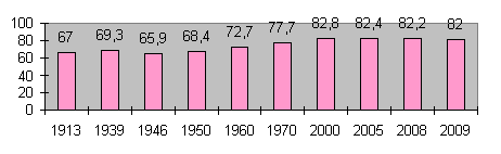 Рисунок 9 - Прирост населения Германии (составлено автором по: [60]). В 2002 г. родилось 725 тыс. детей, умерло 845 тыс. чел., что почти на 3% превышает уровень предыдущего года. Отрицательная разница между родившимися и умершими выросла до 120 тыс. чел. При этом детская смертность в Германии невелика – 3,9 чел. на 1000 живорождённых – и продолжает снижаться. Несмотря на подобные тенденции население страны не сокращается и даже немного растет вследствие превышения иммиграции над эмиграцией: в 2001 г. эта разница составила 275 тыс.чел., тогда как в 2000 г. всего 167 тыс. По коэффициенту рождаемости (9 новорожденных на 1000 жителей в год) Германия относится к странам с самой низкой рождаемостью. Детей рождается слишком мало, и они рождаются слишком поздно. Первый ребенок у женщин рождается в основном, когда им уже за 30 и на каждую женщину сегодня приходится в среднем всего 1,3 ребенка. Тем не менее, численность населения за последние годы оставалась стабильной. Дефицит новорожденных был компенсирован за счет притока около 3 млн. мигрантов. Низкий уровень рождаемости и растущая продолжительность жизни (у новорожденных мальчиков она составляет сегодня 74,4 года, у девочек - 80,6 лет) влияют, однако, на возрастную структуру населения. Предполагается, что доля людей старше 60 лет вырастет с 23 проц. на сегодняшний день до примерно 30 проц. в 2030 г.; соотношение между теми, кто активно участвует в трудовой жизни. [51] Германия ведет политику поощрения рождаемости. Правительство ФРГ в 1974 г. разрешило распространение контрацептивных средств и сняло ограничения на аборты в первые три месяца беременности, однако в начале следующего года верховный суд страны признал неконституционным разрешение абортов «по желанию» и ограничил право на них только «медицинскими показаниями» или другими чрезвычайными обстоятельствами. В наше время в Германии принята сложная система поощряющих мероприятий демографической политики, которая делится на три основные группы: Семейные пособия и надбавки; Пособия при родах;Жилищные льготы. Одна из демографических проблем – старение населения: доля лиц пожилого возраста (65 лет и старше) 18,9%, детей до 14 лет 14,4%, лиц трудоспособного возраста (от 15 до 64 лет) 66,7%. В среднем на 100 женщин приходится 96 мужчин. Средняя продолжительность жизни на 2009г. 79,26 года (мужчины 75,8, женщины 82,0 года) – по средней продолжительности жизни у женщин Германия занимает одно из первых мест в мире. [31] В настоящее время в Германии проживает около 7,3 млн. иностранцев, что составляет 8,9% всего населения. В период с середины 1950-х по конец 1973 года в Западную Германию приехало большое количество иностранных работников. Бурно развивавшаяся экономика требовала дополнительной рабочей силы, которая вербовалась, прежде всего, в государствах средиземноморского региона, сначала в Италии, затем в Испании, Португалии, бывшей Югославии, Турции, а также в Тунисе и Марокко. Многие из них остались в Германии, а позже перевезли сюда и свои семьи. Германия - этнически однородная страна. На границах с Нидерландами и Данией проживают несколько тысяч датчан и голландцев. На востоке около 100 тыс. лужицких сербов. Почти 5 млн. составляют эмигранты из Турции, стран Центральной и Восточной Европы, приехавшие сюда на заработки и постоянное место жительства. Эмиграция дополняет комплекс социальных и политических пр