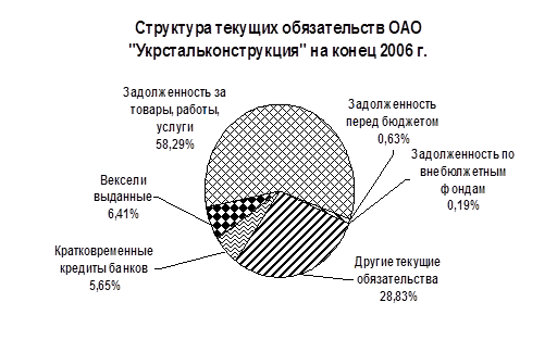 Диаграмма 2 В привлеченном капитале доминируют текущие обязательства, возросшие, доля которых составляет к концу года 89,20% от общей валюты баланса и 100% от всего заемного капитала предприятия. Сумма долгосрочных кредитов стала равна нулю, что говорит о повышенном риске утраты финансовой стабильности и плохой структуре баланса. В текущих обязательствах, как видно из диаграммы 2 большую часть занимает кредиторская задолженность за товары, работы, услуги (на конец года 58,29%). Положительным моментом является достаточно низкая доля задолженности перед бюджетом (0,63%), несмотря на самый большой показатель прироста (746,25%). Как мы можем судить из таблицы в приложении К, имущество предприятия за 2006 год возросло на 14938 тысячи гривен, что является положительным фактором. Наибольший удельный вес в структуре баланса имеют оборотные активы (95,20% к концу года), наглядно это показано на Диаграмме 3, это говорит о достаточно мобильной структуре активов, «легкой» их структуре, и является положительным фактором. Опережение темпов роста оборотных активов над внеоборотными свидетельствует о расширении производственной деятельности предприятия. Внеоборотные активы предприятия уменьшились за отчетный период на 32229 тыс. грн, а их доля в активах баланса уменьшилась на 31,22% (с 36,02% в начале до 4,80% в конце года), что так же является положительным фактором.