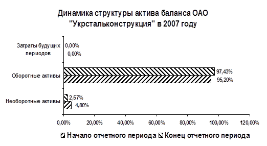 Диаграмма 7 Как мы можем судить из таблицы в приложении Л, имущество предприятия за 2007 год возросло на 79052 тыс. грн, что является положительным фактором. Наибольший удельный вес в структуре баланса имеют оборотные активы (97,43% к концу года), наглядно это показано на Диаграмме 7, это говорит о достаточно мобильной структуре активов, «легкой» их структуре, и является положительным фактором. Опережение темпов роста оборотных активов над внеоборотными свидетельствует о расширении производственной деятельности предприятия. Внеоборотные активы предприятия уменьшились за отчетный период на 641 тыс. грн, а их доля в активах баланса уменьшилась на 2,23% (с 4,80% в начале до 2,57% в конце года), что так же является положительным фактором. В структуре внеоборотных активов уменьшилась доля долгосрочной дебиторской задолженности, долгосрочных финансовых инвестиций и нематериальных активов, часть же основных средств наоборот увеличилась.