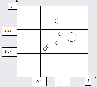 Рис.2.1 Матриця БКГ для "Кіровський спеціалізований кар’єр" Отже, дане підприємство має 6 різних стратегічних господарських підрозділів, які займають відповідні позиції на побудованій матриці: 1) Щебінь – "важкі діти"; 2) Шашка-мозаїка – "важкі діти"; 3) Фундаментні блоки – "собаки"; 4) Облицювальна плитка – "важкі діти"; 5) Бордюр – "собаки"; 6) Камінь бутовий – "важкі діти". Більш детальний варіант матриці БКГ був запропонований компанією "General Electric" у співпраці з компанією "McKincey", яку називають матриця "привабливість – конкурентоспроможність". Основними показниками (індикаторами), що використовуються за оцінкою привабливості галузі (ринку), є: розмір ринку, темпи зростання, конкурентна ситуація, рівень цін, прибутковість, технологічний рівень, державне регулювання, чутливість до загальногосподарської кон’юнктури. Конкурентоспроможність СГП визначається за такими показниками: розмір, темп зростання, частка ринку за сегментами, прихильність покупців, прибутковість, ефективність розподілу, технологічний потенціал, гнучкість, організаційна структура. За коефіцієнтами вагомості показників привабливості ринку та конкурентоспроможності СГП зображених в табл. 2.6. визначаємо показники: Пр.щ = 0,1*4+0,1*1+0,1*3+0,2*4+0,2*3+0,1*3+0,2*1 = 0,4+0,1+0,3+0,8+0,6+0,3+0,2=2,7. К щ = 0,2*3+0,2*2+0,2*4+0,2*4+0,2*5=0,6+0,4+0,8+0,8+1=3,6. Пр.ш-м = 0,1*4+0,2*2+0,1*4+0,2*3+0,2*4+0,1*3+0,1*1 = 0,4+0,4+0,4+0,6+0,8+0,3+0,1=3. К ш-м = 0,2*3+0,2*2+0,2*2+0,2*3+0,2*5=0,6+0,4+0,4+0,6+1=3. Пр.фб = 0,05*1+0,05*1+0,2*2+0,2*2+0,3*3+0,1*2+0,1*1 = 0,05+0,05+0,4+0,4+0,9+0,2+0,1=2,1. К фб = 0,1*2+0,1*1+0,3*2+0,2*3+0,3*2=0,2+0,1+0,6+0,6+0,6=2,1. Пр.оп = 0,1*5+0,3*5+0,1*4+0,1*3+0,2*4+0,1*3+0,1*1 = 0,5+1,5+0,4+0,3+0,8+0,3+0,1=3,9. К оп = 0,1*1+0,2*3+0,2*3+0,2*3+0,3*3=0,1+0,6+0,6+0,6+0,9=2,8. Пр.б = 0,05*1+0,05*1+0,1*3+0,2*3+0,3*2+0,2*2+0,1*1 = 0,05+0,05+0,3+0,6+0,6+0,4+0,1=2,1. К б = 0,2*1+0,1*1+0,2*2+0,2*3+0,3*2=0,2+0,1+0,4+0,6+0,6=1,9. Пр.кб = 0,2*2+0,1*2+0,1*3+0,2*3+0,2*3+0,1*3+0,1*1=2,5. К кб = 0,2*2+0,1*2+0,2*3+0,2*4+0,3*4=0,4+0,2+0,6+0,8+1,2=3,2. Таблиця 2.6 Показники привабливості ринку та конкурентоспроможності СГП для підприємства "Кіровський спеціалізований кар’єр"