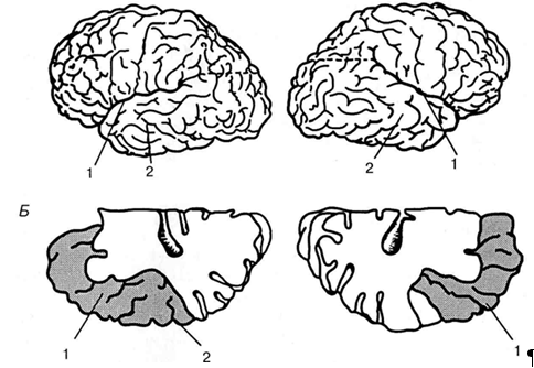 Рис. 1 - Анатомічна асиметрія кори головного мозку людини: А – Сільвієва борозна, яка визначає верхню межу скроневої ділянки (1), піднімається більш круто в правій півкулі порівняно з лівою; 2 – скронева ділянка; Б – верхня частина скроневої ділянки (1), як правило, значно більша в лівій півкулі, ніж в правій. Дана область в лівій півкулі є складовою зони Верніке (2), яка відіграє важливу роль в мозковій організації мовних процесів (по Н. Гешвінду) Цитоархітектонічне вивчення полів 22 та 41 скроневих ділянок мозку людини показало особливості топографії та нейронного складу даних полів в лівій та правій півкулі. В лівій півкулі в полі 22 радіальна посмугованість більш тонка, ніж в правій та краще виявлена у більшості випадків. Шари кори досить добре відмежовані один від одного, як в праві, так і в лівій півкулях. Проте, спостерігається тенденція до більшої вираженості меж між шарами в лівій півкулі, що вказує на кращу горизонтальну посмугованість кори поля 22. Впорядкованість структур та ширина ІІІ та V шарів поля 22 більше в лівій півкулі. Пірамідні нейрони ІІІ шару розміщуються колонками, що вказує на більш високу ступінь вертикальної організації поля 22 в лівої півкулі, порівняно з правою. Таким чином, поля 41 та 22, різні по функціональному значенні коркові слухові формації, мають різний цитоархітектонічний рисунок, що характеризується різною величиною площі профільних полів нейронів. Відомо, що в лівій півкулі більш ефективно здійснюється обробка вербальних стимулів мовного походження та інтенсивніше відбувається обробка складних граматичних конструкцій. Лівопівкулеву асиметрію площі профільного поля нейронів поля 22 (зона Верніке) можна пояснити тісним зв‘язком з мовноруховою зоною кори (поле 45), функціональна активність якої, більш виражена в лівій, домінантній по мові, півкулі. Крім того, показано зв‘язок між ведучою рукою та латералізацією слухових функцій людини. Так, функція правого вуха більш латералізована у праворуких, що характеризується вираженою лівопівкулевою асиметрією мовносприймаючої функції мозку. Поле 41 є проекційним та складається з нейронів малого розміру в обох півкулях мозку. Дане поле належить до первинної слухової кори та є закінченням слухового аналізатора в корі, куди надходить звукова інформація і де відбувається її первинне кодування. Площа профільних нейронів поля 41 в правій півкулі дещо вища, ніж в лівій. Це пов‘язано з тим, що в процесі первинного кодування звукових стимулів права півкуля в більшій мірі, як ліва, відіграє роль своєрідного «фільтра», виділяючи «сигнал» з «шуму» [15]. Порівняно з полем 41, в полі 22 нейрони мають більші розміри, що відображає функціональну специфічність поля 22 як асоціативної ланки в складному процесі сприйняття та обробки звукових стимулів різної природи. Більш виражена асиметрія площі профільних нейронів в полі 22, порівняно з полем 41, пов‘язана з тим, що поле 22 філогенетично більш нове утворення кори головного мозку людини, складність побудови і функціонування даної структури пов‘язано з появою такого нейролінгвістичного феномену як мова, характерної лише для людини. Таким чином, загальноприйнятим вважається факт, що коркові ділянки, які задіяні в відтворенні мовних сигналів, мають велике представництво в лівій півкулі [32].Такі відмінно характерні і для задньо