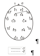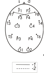 Рис. 6 - Просторовий розподіл статистично достовірних відмінностей внутрішньо- та міжпівкулевих взаємодій на не значимі звукові стимули у осіб з різним типом мануальної асиметрії (50:50): 1 – достовірно вищий коефіцієнт кореляції у праворуких осіб, 2 – достовірно вищий коефіцієнт кореляції у ліворуких осіб. Відведення: F – лобові, T – скроневі, C – центральні, P – тім’яні, O – потиличні; s – ліва, в – права півкулі При подачі не значимих стимулів (25:75) статистично достовірно вище значення коефіцієнтів кореляції зафіксовані у праворуких осіб між лівою бічною та правою задньою (r=0,66