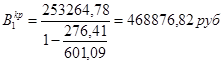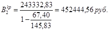 АОзд = Na * Сперв АОзд = 0,02*2 000 000,00 = 40 000,00 руб. 4.1.6 Затраты на овещение: Зосв = N* T* S* η* Ц, где N - установленная мощность 0,15 кВт T - время освещения 3003 ч S - площадь освещения 100 м2 η - коэффициент неравномерности 0,3 Ц - цена 3,1 руб. Зосв = 0,15 * 3003 * 100 * 0,3 * 2,10 = 28 378,35 руб. 4.1.7 Затраты на рекламу: Зр = 0,01* ФЗПг общ Зр = 0,01*1 111 963,07 = 11 119,63 руб. 4.1.8 Командировочные расходы: Зк =3500+500+1000 = 5 000,00 руб. 4.1.9 Затраты на расчетно-кассовое обслуживание: Зб = 0,01* ФЗПг общ, Зб = 0,01*1 111 963,07 = 11 119,63 руб. Итого постоянные годовые издержки (накладные расходы): С пост год = 496 597,61 руб. Разделим постоянные издержки (накладные расходы) пропорционально переменным издержкам: Спост год 1 = С пост год *0,51 = 496 597,61*0,51=253 264,78 руб. Спост год 2 = С пост год *0,49 = 496 597,61*0,49=243 332,83 руб. Сумма переменных и постоянных издержек (годовая себестоимость): Сгод 1 = 667 873,24 руб. С год 2 = 648 130,69 руб. Методом калькуляции находим стоимость услуг: Ст = Сгод /N Ст1 = 667 873,24/1500 = 445,25 руб. Ст2 = 648 130,69 /6000 = 108,02 руб. Норма рентабельности: Принимаем норму рентабельности (в долях) R= 0,35 Прибыль: Пр=Ст* R Пр1 = 445,25*0,35 = 155,84 руб. Пр2 =108,02*0,35 = 37,81руб. Цена услуги: Ц=Ст + Пр, Ц1 = 445,25+155,84 = 601,09 руб. Ц2 = 108,02+37,81= 145,83 руб. 4.2 Затратно-маркетинговый метод. 4.2.1 Принимаем скидку 5% на первую услугу. Ск = Ц1 *5% Ск= 601,09 *0,05 = 30,05 руб. 4.2.2 Цена со скидкой: Ц1ск = Ц1 -Ск Ц1ск = 601,09-30,05=571,04 руб. 4.2.3 Перераспределение переменных издержек: N1 *Ск = 1500*30,05 = 45 075 руб. Спер год1 =414 608,46 - 45 075 = 369 533,46 руб. Спер год2 =404 797,86+45 075= 449 872,86 руб. 4.2.4 Сумма переменных и постоянных издержек: Сгод = Спер год + Спост год Сгод 1 = 369 533,46+ 253 264,78 = 622 798,24 руб. С год 2 = 449 872,86 + 243 332,83= 693 205,69 руб. 4.2.5 Стоимость услуги: Ст = Сгод /N, Ст1 = 622 798,24/1500 = 415,20 руб. Ст2 = 693 205,69/6000 = 115,53 руб. 4.2.6 Цена услуги: Ц1 = 415, 20*1,35 = 560,52 руб. Ц2 = 115,53 *1,35 = 155,97 руб. 4.3 Ценообразование на базе безубыточности. Доходы: В = Ц* N, Где Ц - цена услуги, N - количество услуг. В1 = 601,09 *1500 = 901 635 руб. В2 = 145,83 *6000 = 874 980 руб. Итого: В=В1 + В2 = 901 635 +874 980 = 1 776 615 руб. Годовая себестоимость (сумма переменных и постоянных годовых издержек): Сгод 1 = 667 873,24 руб. С год 2 = 648 130,69 руб. Валовая прибыль (прибыль брутто, прибыль до налогооблажения): Прбрутто = В - Сгод , Где В - доход, Сгод - годовая себестоимость. Пр1 брутто = 901 635 - 667 873,24= 233 761,76 руб. Пр2 брутто =874 980 - 648 130,69 = 226 849,31 руб. Итого: Прбрутто =233 761,76 + 226 849,31= 460 611,07 руб. Единый налог на вмененный доход: ЕНВД = Ст*ВД, где Ст = 15% - налоговая ставка. ВД - вмененный доход. ВД = БД * N* К1 *К2 *К3, Где: БД = 12 000 руб. - базовая доходность, N - количество единиц физического показателя, К1 - коэффициент, зависящий от видов выполнения предпринимательской деятельности (К1 =1 для автомобильного транспорта); К2 - коэффициент, учитывающий место занимаемых площадей земель в кадастре; К3 - коэффициент дефлятор К3 =1,143. БДгод = 12 000*2*1*0,9*1,143*12 = 296 265,60 руб. ЕНВД = 0,15*296 265,60 = 44 439,84 руб. Чистая прибыль (прибыль нетто, прибыль после налогообложения): Прнетто = Прбрутто - ЕНВД = 460 611,07 - 44 439,84 = 416 171,23 руб. Критический объем: