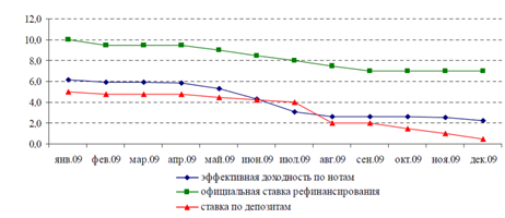Также Национальный Банк привлек депозиты Министерства финансов в тенге на общую сумму 5 732,8 млрд. тенге по средней ставке 0,25% годовых, средний срок привлечения составил 7 дней. В 2009 году Национальный Банк постепенно снизил официальную ставку рефинансирования с 10,5% до исторически минимального уровня – 7,0%. С 10 августа 2009 года Национальный Банк принимает депозиты от банков сроком на 7 дней и 1 месяц. Ставки по данным депозитам были первоначально установлены на уровне 2,0% и 2,5%, соответственно, а в последствии постепенно снижались. С 1 декабря 2009 года ставки по депозитам от банков сроком на 7 дней составляют 0,5%, по депозитам сроком на 1 месяц – 1,0% (рисунок 2.4.).