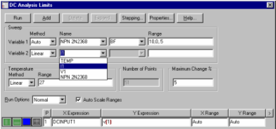 Рис. 7 Команды: Окно содержит те же команды (Run, Add, Delete и др.), что и в режимах анализа временных и частотных характеристик. Числовые параметры: Строка Variable 1 предназначена для задания первой варьируемой переменной и содержит несколько граф. В графе Method выбирается метод варьирования первой переменной: - Auto – автоматический; - Linear – линейный (задается в графе Range по формату Final[,Initial[,Step]]). Если не указан шаг (Step) варьируемой переменной, то он устанавливается по умолчанию равным 1/50 диапазона задаваемой переменной. Если не задавать начальное значение параметра, то по умолчанию ему будет присвоено нулевое значение; - Log – логарифмический масштаб переменной; - List – в виде списка значений переменной, разделяемых запятой. В графе Name выбирается имя варьируемой переменной, причем в качестве таковой могут быть заданы не только источники напряжения и тока, но и температура или имя одного из компонентов, имеющих математические модели (например, диода или транзистора). При выборе такого компонента в расположенном справа окне выбирается варьируемый параметр его математической модели (на рис. 6 это параметр BF – коэффициент усиления тока транзистора). Строка Variable 2 позволяет задать вторую варьируемую переменную. Если она отсутствует, то в графе Method выбирается None. Temperature – диапазон изменения температуры в градусах Цельсия. Как и при других видах анализа, можно выбрать линейную (Linear) или логарифмическую (Log) шкалу изменения температуры, а также указать список (List) температур. В случае использования температуры в качестве одной из варьируемой переменной она обозначается как переменная TEMP при моделировании. Number of Points – количество точек характеристики, выводимой в табличной форме. Maximum change, % - максимально допустимое приращение графика первой функции на одном шаге варьируемой переменной (в процентах от полной шкалы). Используется при автоматическом (Auto) варьировании первой переменной. Если график функции меняется быстрее заданного приращения, то шаг приращения первой переменной автоматически уменьшается. Опции: Run Options – управление выдачей результатов расчетов: - Normal – результаты расчетов не сохраняются; - Save – сохранение результатов расчета в бинарном файле <имя схемы>.dsa; - Retrieve – считывание последних результатов расчета из созданного ранее файла <имя схемы>.dsa. Auto Scale Ranges – автоматическое масштабирование по осям X и Y для каждого нового варианта расчетов. Остальные разделы окна DC Analysis Limits аналогичны разделам рассмотренных выше окон задания параметров в режимах анализа Transient и AC. На рис. 8 в окне анализа показан пример расчета семейства выходных статических характеристик транзистора – зависимости тока коллектора (Ic[Q1]) от приложенного к транзистору напряжения (Vce[Q1]) при варьировании тока базы (I1). В окне схем изображена схема подключения независимых источников напряжения и тока к транзистору Q1 при моделировании передаточных функций. В соответствии с рис. 7 напряжение питания V1 (V1=Vce[Q1]) меняется при моделировании от 0 до 5 В, а базовый ток I1 при построении графиков варьируется с шагом 0,5 мА в диапазоне 0…5 мА. Моделирование проведено при температуре транзистора 27 С0 .