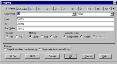 Рис. 8 Для наглядности на этом же рисунке приведен фрагмент окна задания параметров моделирования, значения которых и определяют вид семейства выходных характеристик транзистора. 4. Многовариантный анализ (Stepping) Во всех трех видах анализа Transient, AC и DC предусмотрена возможность многовариантного анализа характеристик схем. Диалоговое окно Stepping, имеющее 20 закладок и позволяющее задать вариации от одного до двадцати параметров схемы, можно вызвать или из окна задания параметров моделирования, или щелкнув курсором по пиктограмме Step What – строка выбора имени компонента и его варьируемого параметра. Содержание строки зависит от выбранного на панели Parameter Type типа параметра: Component, Model или Symbolic.