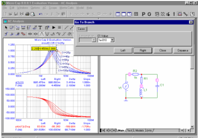 Рис. 9 Parameter Type – тип варьируемого параметра: Component – в качестве варьируемого компонента схемы указывается его имя, выбираемое из списка, открываемого кнопкой Model – в качестве варьируемой величины указывается параметр модели компонента. Имя модели и соответствующий параметр выбираются из списков, открываемых кнопкой Symbolic – изменяемый параметр выбирается из списка параметров, определенных по директиве .define. Следующие три строки определяют: From – начальное значение выбранного параметра. При использовании логарифмической шкалы оно должно быть больше нуля; To – конечное значение параметра. При выборе логарифмической шкалы оно также должно быть больше нуля; Step value – величина шага параметра. При линейной шкале она прибавляется к текущему значению, а при логарифмической шкале умножается на текущее значение параметра. Последние две строки недоступны, если используется списочный (List) способ задания значений параметров. Method – характер изменения варьируемого параметра: - Linear – линейная шкала; - Log – логарифмическая шкала; - List – список значений. Step It – включение (Yes) или выключение (No) режима вариации параметров. Change – метод изменения нескольких параметров: - Step all variables - одновременное изменение всех варьируемых параметров (количества вариаций всех параметров должны быть равны между собой); - Step variables in nested loops - поочередное (вложенное) изменение варьируемых параметров (во внешнем цикле изменяется переменная, указанная на 1-й закладке). Перед выполнением вариации параметров схемы рекомендуется убедиться, что моделирование выполняется без ошибок при номинальном значении параметров, т.е. схема задана правильно. Далее, вызвав окно Stepping, необходимо задать требуемые параметры варьирования, включить режим Stepping и, щелкнув по кнопке «OK», перейти в окно выбранного режима анализа. Для построения графиков исследуемых характеристик достаточно снова запустить режим анализа с помощью клавиши F2 или кнопки Run. Пример многовариантного расчета частотных характеристик (АЧХ и ФЧХ) резонансного контура при вариации емкости конденсатора приведен на рис. 10. Варьируемые значения емкости конденсатора С1, соответствующие различным кривым семейства характеристик, введены в первое графическое окно анализа (АЧХ) с помощью команды Label Branches из меню режима электронной лупы Scope. При последующем детальном анализе одной из кривых семейства можно воспользоваться диалоговым окном Go to Branch, вызываемым пиктограммой