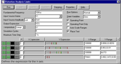 Рис. 15 Далее следуют операторы: IHD(HARM[V(1)],10000) – коэффициент нелинейных искажений отдельных составляющих спектра S в процентах относительно уровня составляющей на частоте F. Задается по формату IHD(S,F), где S – спектр сигнала, а F – частота, указанная в графе Fundamental Frequency диалогового окна; THD(HARM[V(1)],10000) – коэффициент нелинейных искажений спектра S, в процентах относительно уровня составляющей на частоте F. Формат задания оператора – THD(S,F). В последней строке выражений, задаваемых по оси Y (Y Expression), указана анализируемая функция, определенная в графе Output Expression. Приведенные выше выражения являются предопределенными и недоступными для редактирования в режиме Distortion и пользователю предлагается лишь указать номер графического окна (в графе P) для вывода указанных графиков. На рис. 16 показан пример расчета нелинейных искажений сигнала на выходе транзисторного усилителя. В качестве входного сигнала (генератор V1) задано гармоническое колебание с частотой 10 кГц и амплидудой 1 мВ. На первом графике окна моделирования представлен спектр выходного периодического сигнала, снимаемого с коллектора транзистора Q1. Второй график показывает распределение амплитуд гармоник выходного сигнала, возникающих из-за нелинейных искажений, присущих данному усилителю. На третьем графике изображен один период выходного сигнала усилителя V(1), снимаемого с коллектора транзистора Q1.