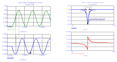 Рис. 5 На рис. 5, а показаны диаграммы изменения падения напряжения на конденсаторе С1 и тока, протекающего в последовательном контуре (рис. 4, а) в режиме свободных колебаний при Q >> 1. Из рис. 5, а следует, что полученные гармоники сдвинуты относительно друг друга по фазе на 900 : при максимальном (по модулю) падении напряжения на конденсаторе ток в цепи равен нулю, а при максимальном токе -напряжение на конденсаторе равно нулю (т.е. конденсатор полностью разряжен). На рис. 5, б изображены АЧХ и ФЧХ последовательного контура (выходное напряжение снимается с узла 2 схемы рис. 4, а). На резонансной частоте (f0