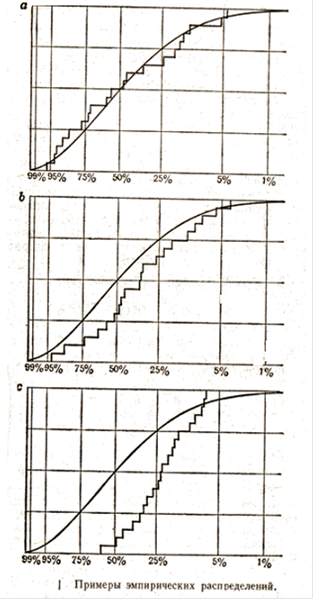 Рисунок 1 – Примеры функций распределения На рис. 2 показаны три эмпирические функции распределения. Там же и изображены и истинные функции распределения F(x). При увеличении n функции Fn (x) должны все более точно аппроксимировать F(x). Критерий Колмогорова-Смирнова можно использовать в тех случаях, когда F(x) не имеет скачков. Он основан на разности между F(x) и Fn (x). Плохой датчик случайных чисел будет давать эмпирические функции распределения, плохо F(x). На рис. 2, b приведен пример, когда значения ξi слишком велики, так что кривая эмпирической функции распределения проходит слишком низко. На рис. 2, c представлен еще худший случай; ясно, что такие большие расхождения между Fn (x) и F(x) крайне маловероятны; КС-критерий должен указать, насколько они маловероятны.