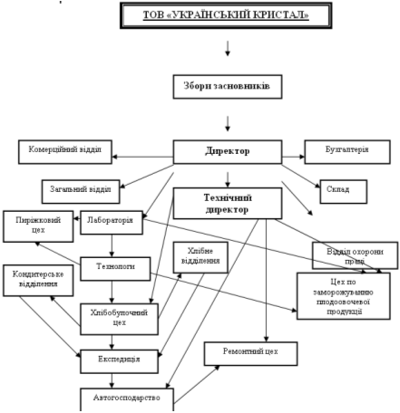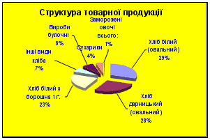 Діаграма 3.1.1. Структура товарної продукції На основі даної таблиці можна зробити висновок, що ТОВ «Український кристал» найбільше випускає хліб білий (овальний). У базисному році підприємство випустило цього продукту на суму 105,5 тис. грн., а у звітному році на суму 465,47 тис. грн., на 359,97 тис. грн. більше ніж у базисному. За останній рік підприємство випустило хліб дарницький (овальний) на суму 431,97 тис. грн., що на 332,07 тис. грн. більше ніж у базисному році. Ще було вироблено велику кількість хліба білого з борошна 1 ґатунку. У звітному періоді ТОВ «Український кристал» випустило цей вид продукту на 272, 09 тис. грн. більше ніж у базисному періоді. Показники діаграми показують, що найбільшу питому вагу у звітному році займають хліб білий (овальний) – 29% усієї продукції, хліб дарницький (овальний) – 28%, хліб білий з борошна 1 ґатунку. Організаційна структура відображена в схемі 3.1.1.