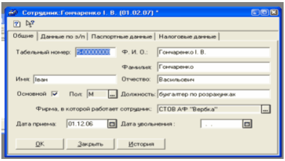 Довідник призначений для зберігання інформації про працівників організації. Він містить таку інформацію про працівників як: П.І.Б. працівника, стать, посада, дата прийняття на роботу, кількість дітей у працівника, паспортні дані. Також він містить закладку Дані про з/п , в якій містяться необхідні дані для нарахування заробітної плати. Це є місячний оклад (або погодинний тариф), розмір авансу, кількість дітей і кількість пільг за прибутковим податком, а також рахунок і стаття затрат, за якими списуватиметься сума нарахованої заробітної платні.
