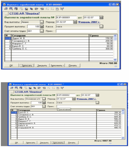 Для формування друкованої форми платіжної відомості, бухгалтерських проведень, що відображають факт виплати заробітної плати працівникам призначений документ «Выплата зароботной платы » , який наведено нижче .Перший зразок для виплати авансу, а другий для виплати основної заробітної плати.