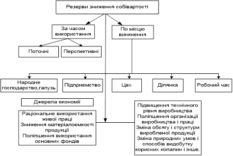 Рис 3.1 Класифікація резервів зниження собівартості продукції Важливим фактором зниження собівартості продукції є підвищення продуктивності праці на основі комплексної механізації та автоматизації виробництва і раціональної побудови організаційної структури приватних підприємств, впровадження в них досконалого внутрішньогосподарського економічного механізму та ефективних орендних відносин. Резервом зниження собівартості є інтенсивне використання машинно – тракторного парку, сільськогосподарських машин і знарядь, механізмів і обладнання твариницьких ферм, транспортних та інших засобів праці. За цих умов зменшуються витрати з розрахунку на одиницю виконаних робіт, що сприяє зниженню собівартості продукції. Необхідно також забезпечити ефективніше використання машинно – тракторного парку, транспортних засобів, живої тяглової сили. Це дасть змогу скоротити потреби в них до раціонального рівня, зменшити виртрати на амортизацію та ремонти, а через це здешевити виробництво продукції. Значні резерви зниження собівартості криються в суворому дотриманні режиму економії при використанні матеріально – грошових засобів у процесі виробництва сільськогосподарської продукції. Практика переконує, що в підприємствах, де контролюється економне використання оборотних фондів, де не допускаються втрати врожаю при збиранні і транспортуванні, збереженні насіння, посадкового матеріалу, кормів, значно менше витрачається коштів на одиницю продукції Істотного знмження собівартості продукції можна досягти завдяки вдосконаленню системи управління виробництвом і впровадженню наукової організації праці. Ці заходи забезпечують зменшення накладних витрат, а отже, і зниження собівартості продукції. Важливу роль тут відіграють і такі соціально – економічні фактори, як підвищення кваліфікації кадрів, матеріальна заінтересованість працівників у результатах своєї праці, широке використання моральних стимулів. Розглянуті фактори зниження собівартості продукції окреслюють лише загальні напрями скорочення витрат на її виробництво. В кожному підприємстві необхідно передбачити конкретні заходи щодо здійснення режиму економії і бережливості, підвищення врожайності культур і продуктивності тварин, враховуючи місцеві природно – економічні умови. У результаті інноваційної діяльності створюються необхідні умови щодо зниження витрат виробництва і, відповідно, одержання прибутку. Для цього необхідні нововведення в усіх видах діяльності підприємства: виробничій, комерційній, управлінській і т. д. Тільки в цьому разі можна знизити витрати і забезпечити надлишки зверх витрат. А це можливо, коли фірма здійснить ряд заходів, спрямованих на підвищення продуктивності праці. ВИСНОВКИ Дана курсова робота показує важливість та необхідність впровадження аналізу собівартості у діяльності сільськогосподарського підприємства. Сучасний стан аналізу є достатньо розробленою, у теоретичному плані, наукою. Ряд методик використовується в управлінні виробництвом на різних рівнях. Важливим показником, який характеризує роботу сільськогосподарських підприємств є собівартість продукції. Від її рівня залежать фінансові результати діяльності підприємства, темпи розширеного виробництва, фінансовий стан господарюючих суб'єктів. Аналіз с