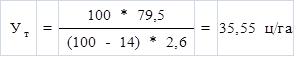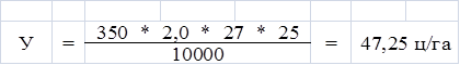 где Ут - урожайность зерна при стандартной влажности, ц/га; W - стандартная влажность по ГОСТу, % ; А - сумма частей в соотношении основной и побочной продукции в общем урожае биомассы. Урожайность озимой ржи "Вятка" при стандартной влажности составит: