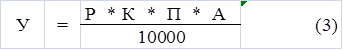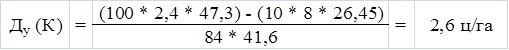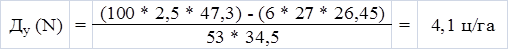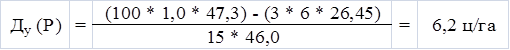 где Ду - доза азотных, фосфорных, калийных удобрений, ц/га; Ут - планируемая урожайность, т/га; В - вынос питательных веществ на 1 т продукции, кг; Сп - содержание питательных веществ в почве, мг/100г почвы; Км - коэффициент перевода питательных веществ на пахотный слой; Ку - коэффициент использования элементов питания из удобрений, %; Кп - коэффициент использования питательных веществ из почвы, %; Су - содержание элементов питания в удобрениях, %. Для совместном внесении органических и минеральных удобрений расчет ведут по формуле: Км = h * v (5) где h - глубина пахотного слоя, см; v- объемная масса почвы, г/см. Км =23*1,15=26,45 Рассчитаем дозу минеральных удобрений под озимую рожь "Вятка" на запланируемый урожай - 47,3 ц/га: 1. Содержание питательных веществ в почве N- 6 мг/100 г P2O5- 3 мг/100 г К2О - 10 мг/100 г 2. Вынос питательных веществ с 1 ц урожая N- 2,5 кг P2O5- 1,0 кг К2О - 2,4 кг 3. Коэффициент использования питательных веществ из почвы N- 27 % P2O5- 6 % К2О - 8 % 4. Коэффициент использования питательных веществ из удобрений N- 53 % P2O5- 15 % К2О - 84 % 5. Вносим в почву: аммиачная селитра - 34,5% д.в. суперфосфат двойной - 46,0 % д.в. калийная соль - 41,6 % д.в.