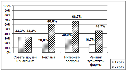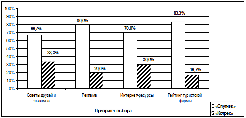 Исходя из данных таблицы, определим приоритетные направления, которые, по нашему мнению, в большей степени будут влиять на повышение конкурентоспособности туристкой организации, и с учетом которых будет разработаны мероприятия. Далее сравним следующие приоритетные направления такие, как: «реклама», «информация о туристской фирме в специальных справочниках и в Интернете», а также «советы друзей и знакомых» (рис.2.1).