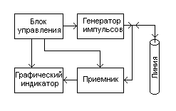 Рис 3.2.1 Упрощенная структурная схема импульсного рефлектометра С генератора импульсов зондирующие импульсы подаются в линию. Отраженные импульсы поступают с линии в приемник, в котором производятся необходимые преобразования над ними. С выхода приемника преобразованные сигналы поступают на графический индикатор. Все блоки импульсного рефлектометра функционируют по сигналам блока управления. На графическом индикаторе рефлектометра воспроизводится рефлектограмма линии – реакция линии на зондирующий импульс. Образование рефлектограммы линии легко проследить по диаграмме, приведенной на рисунке ниже. Здесь осью ординат является ось расстояния, а осью абсцисс – ось времени.