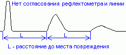 Рис 2.5 Линия с согласованным сопротивлением рефлектометра и нагрузки Вид отраженного сигнала зависит от характера повреждения или неоднородности. Например, при обрыве отраженный импульс имеет ту же полярность, что и зондирующий, а при коротком замыкании отраженный импульс меняет полярность.