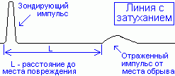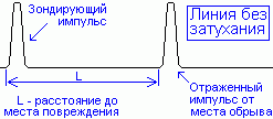 Рис 2.4 Линия с затуханием и без затухания Критерием правильного выбора является минимальное «расплывание» и максимальная амплитуда отраженного сигнала. Если при подключенной линии на рефлектограмме наблюдается только зондирующий импульс, а отраженные сигналы отсутствуют, то это свидетельствует о точном согласовании выходного сопротивления рефлектометра с волновым сопротивлением линии, отсутствии повреждений и наличии на конце линии нагрузки равной волновому сопротивлению линии.